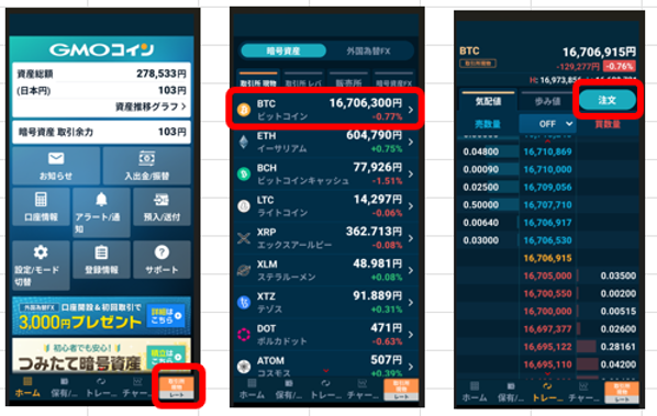 実際の画面を見ながらのほうがイメージしやすいので、ここでは「GMOコイン」のスマホアプリを例に見ていきます。